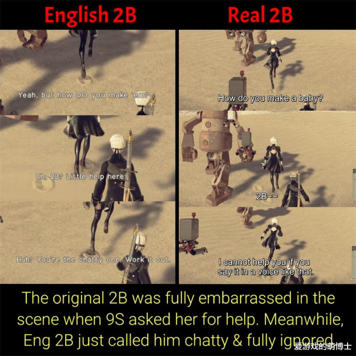 这场争论的中枢围聚在支线任务的对话细节中。最具代表性的一幕是:9S被机械人命体追问“小孩是怎样生出来的?”而蹙悚求救时,日文版的2B报恩得有些不知所措,还带着几分害羞:“就…就算你用那种声息求我,我也帮不了你”,口吻里尽是青娥般的无措,与她平方纰漏的往还姿态酿成反差萌;但在英文版中,这句台词被改成了“你话太多了,我方思想法”(You’re the chatty one. Work it out),口吻冷淡暗示了休止,都备莫得了原版的仁和秉性。