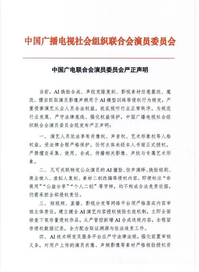 新京报讯 据中国广电聚拢会演员委员会讯息,现时,AI换脸合成、声纹克隆复刻、影视素材任性点窜、魔改、私自捏取演员影像声频用于AI模子磨练等侵权行动频发,严重侵害演艺从业东说念主员正当权力,淆乱视听行业简单规律。为次第行业发展、严称职律底线、强化权力保护,中国播送电视社会组织聚拢会演员委员会现发布严正声明。