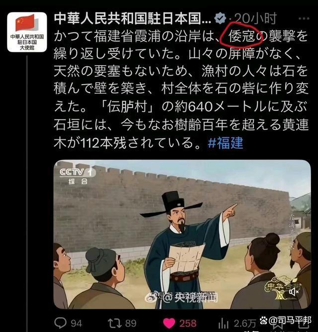 凭据中国驻日大使馆的X账号发布的动态,内容援用明朝历史说了这么一段话:“昔日福建省霞浦的沿岸屡次遭到倭寇的紧要。由于当地莫得山的障蔽,也莫得自然的堡垒,渔村的东说念主们用石头筑起围墙,把扫数这个词村落酿成了石头堡垒...”,驰念日本网友和日本政府看不懂,大使馆还贴心用的日文。