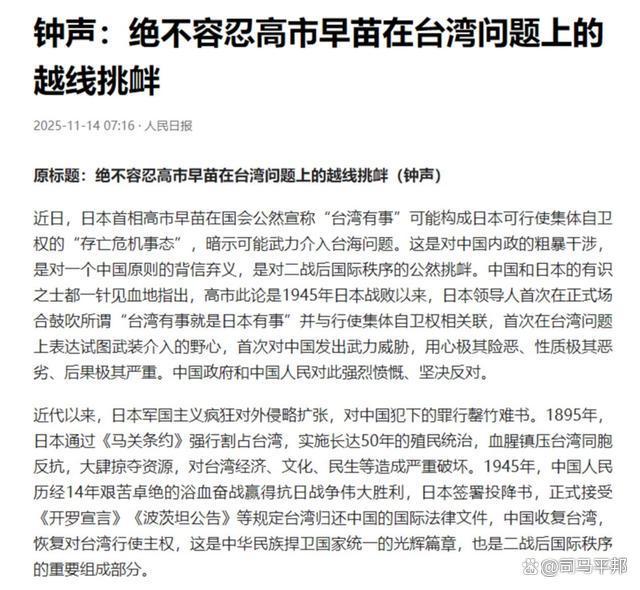 一大早,《东说念主民日报》就对日本发出敲钟劝诫,标题浮松明了:《决不允许高市早苗在台湾问题上越线寻衅》,著述内容亦然言辞强烈,不仅援用历史协议和公告,点破高市早苗公然残暴海外律法的狼子贪心,还点明了中方此次为何揪着高市早苗不放,因为这是80年来,日关键导东说念主初次明确对中国发出武力挟制,再加上高市早苗给核火器松捆和日本网友叫嚣要再打一次甲午海战,很昭彰,日本军国见解贪心如故要藏不住了。